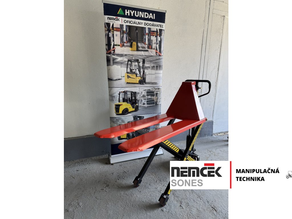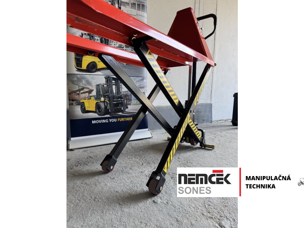 Nožnicový paletový vozík, ručne vedený dokáže zdvihnúť až 1500 kg.